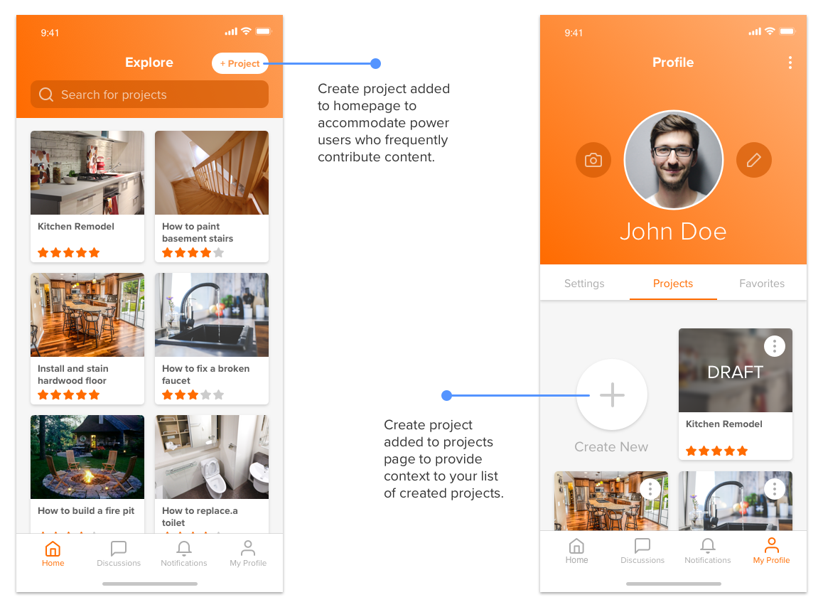 Taking my findings from the previous exercise, my client and I began to frame the major pain points we wanted to focus on for the redesign. Encouraging users to share, discuss and discover projects became the core feature set we wanted to improve overall user engagement and to align the app with HandyMobi’s business strategy. The screens below include examples from brainstorming sessions, affinity diagramming, and workflow interactions that would be used to inform the wireframes I put together for usability testing.
